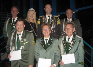 Für 10-jährige Treue zur Bruderschaft wurden mit einer Urkunde geehrt: Rosi Heinrichs (Treu Horrem), Jan Maaßen und Sam Maaßen (Schülerschützen), Matthias Zsagar (passiv) und Pfarrer Peter Stelten, der bereits seit 10 Jahren Präses der Bruderschaft ist. Mit der Silbernen Verdienstspange wurde Jürgen Schumacher (10. Jägerzug) für seine Verdienste ausgezeichnet.