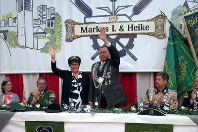 Am Sonntagabend zog der Hofstaat von der Königsresidenz ins Festzelt zum Krönungsball. Hier wurden Schützen und Gäste das neue Königspaar Heike und Markus nochmals mit ihren privaten Interessen vorgestellt. Der Aufmarsch mit den Gratulationen der Schützenzüge beendet den offiziellen Teil.