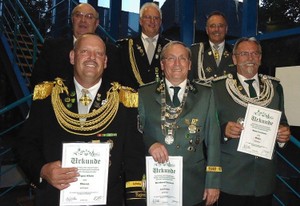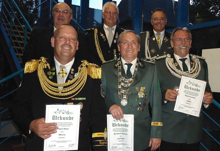 Nach einem erfrischenden Umtrunk zogen die Gäste und das Regiment zum Bürgerhaus, wo sie von der Liveband "Trio Nightlife" erwartet wurden. Brudermeister Manfred Klein durfte neben Grußworten Blumen an Claudia -noch- John überreichen und konnte berichten, dass die Hochzeit mit Oberst Jürgen Klein schon fest geplant sei. Beim Blumenstrauß für Königin Sabine Paul durfte hier nochmals lächelnd nachgefragt werden, wie weit das Königspaar mit den Hochzeitsvorbereitungen sei. Neben den Grüßen an alle Würdenträger galt auch ein Dank dem Thekenteam 5. Jägerzug und XII. Jägerzug, der auch das Catering übernommen hatte. Ein spezieller Dank galt den Firmen, die mit ihrem Sponsoring die Liveband ermöglichten. Die Krönung des Königs der Könige wird erst zu Schützenfest Freitag erfolgen, da Organisator Martin Höfs verhindert war. Oberst Jürgen Klein durfte verdiente Schützen befördern: Zum Leutnant wurden befördert Joachim Melletin (2 Grenadierzug) und Bernhard Schmitt (1. Jägerzug). Zum Oberleutnant befördert wurde Oberstadjutant Udo Zander (1. Jägerzug), den diese Ehrung sehr überraschte. Zum Major wurde René Cosmeci (1. Jägerzug) befördert, der seit 2010 das Amt des Jägermajors inne hat. Vor dem dreifachen Hoch auf die Schützen übernahm Adjutant Udo Zander das Mikrofon und durfte Oberst Jürgen Klein (13. Jägerzug) mit der Beförderung zum Oberst überraschen. Schön, dass dieses Duo, beide seit 2010 in ihren Ämtern, sich hier gegenseitig überraschen konnte. Die Versammlung der Stabsoffiziere, die gemeinsam beschließt, wer befördert wird, hatte eine gute Wahl getroffen.
